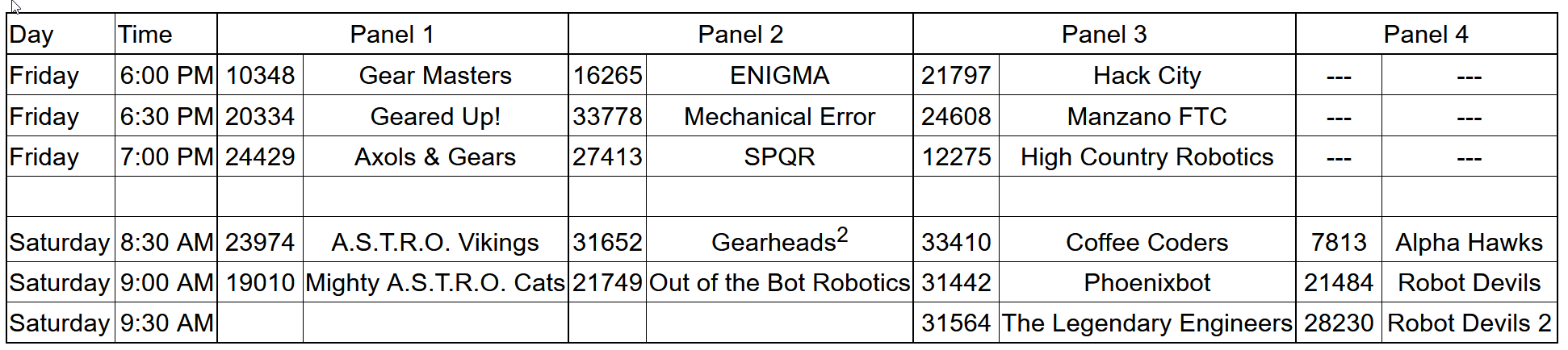 Based on responses we got from teams by the deadline yesterday and the availability of our volunteer judges, here is the schedule for Judging Interviews for the Albuquerque FTC Qualifier this Weekend: